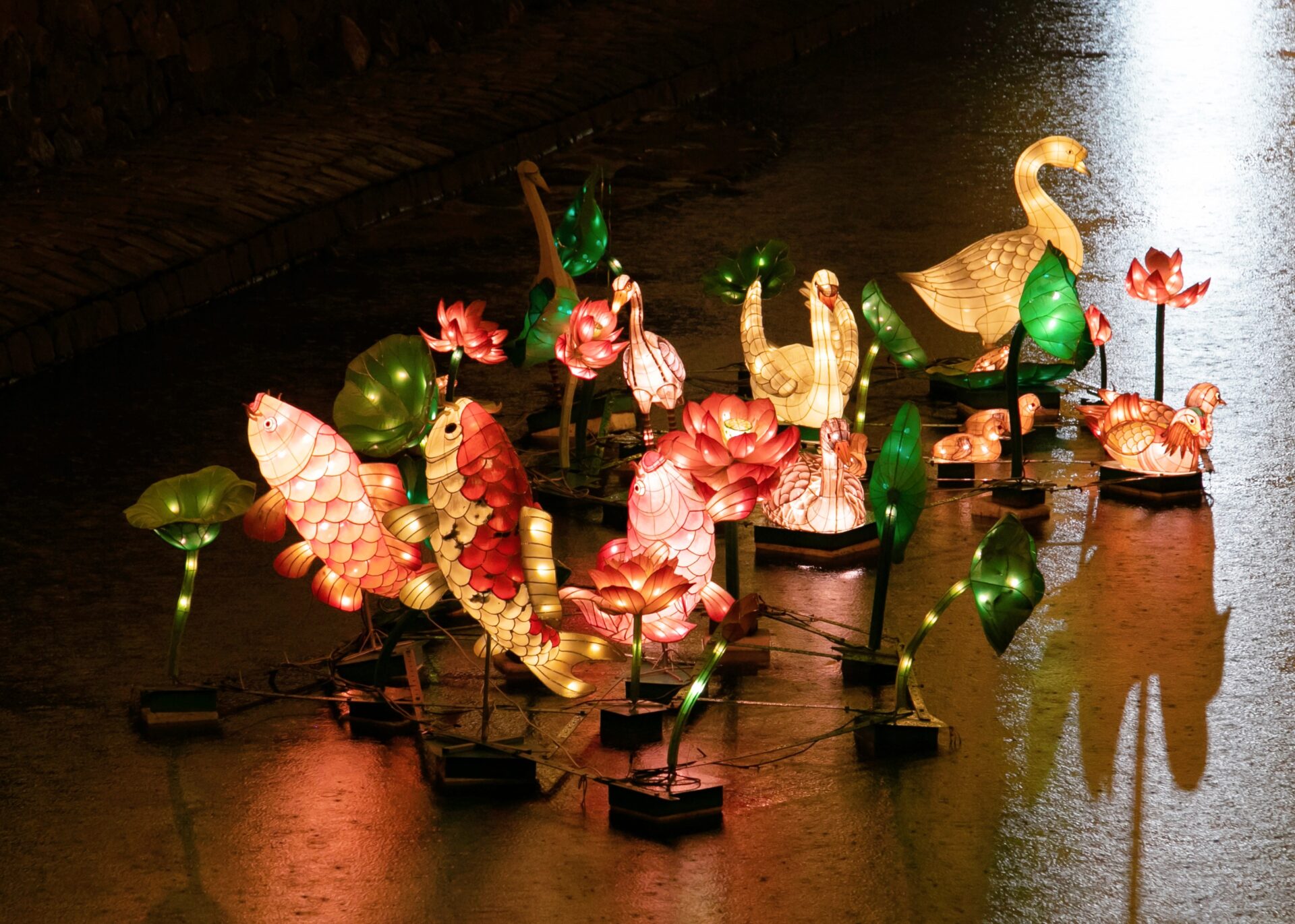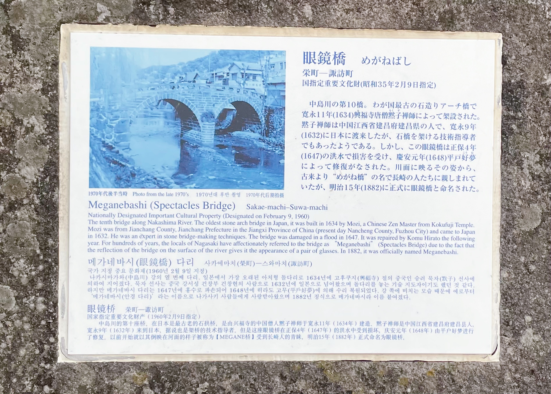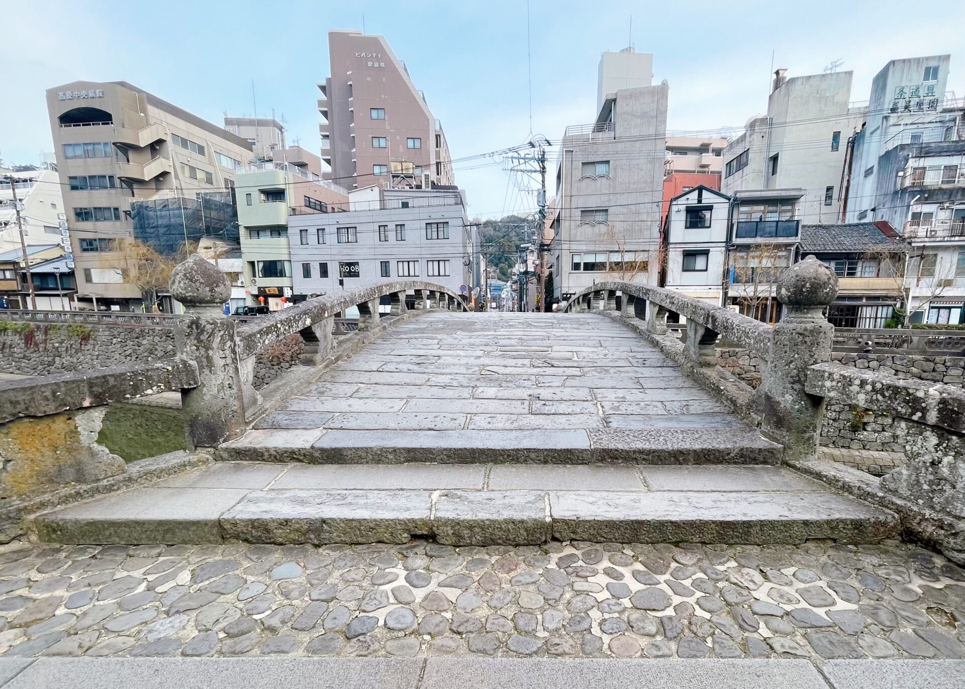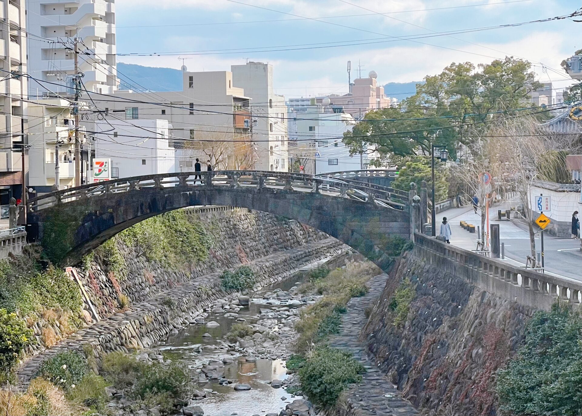 1643年、興福寺の住職 黙子如定が日本最古の石橋である「眼鏡橋」を架橋したことから始まり、数十年をかけて中島川には次々と石橋が架けられました。各橋を渡った先は寺町へと繋がり、各寺院の山門へと続いていることから、寺社参道の石橋群と言われています。中島川石橋群にはなだらかに曲線を描くアーチ型石橋が多くありますが、アーチ型の反橋を極楽浄土へ渡る架け橋とする浄土式庭園の様式を彷彿とさせます。冬の長崎ランタンフェスティバルの時期には、中島川の上空に提灯が連なり、水面に鳥や蓮の花などのランタンオブジェが浮かべられる幻想的な会場となります。