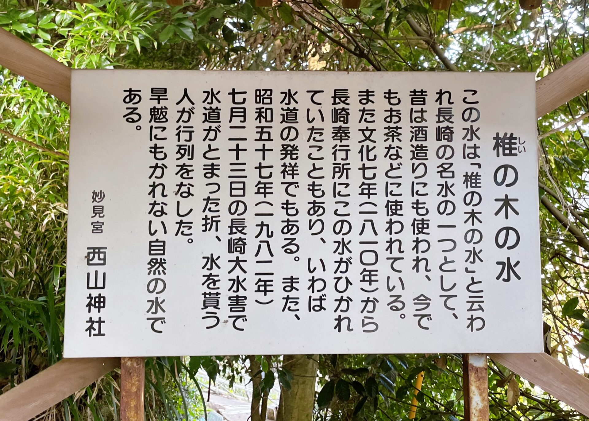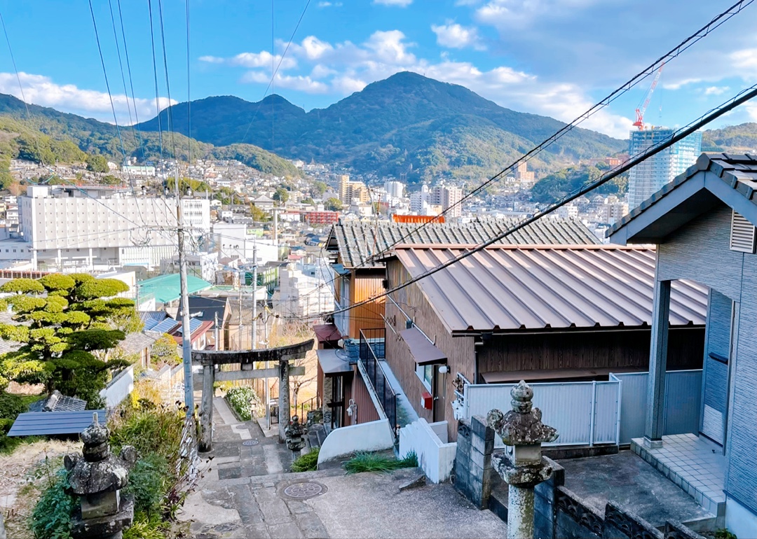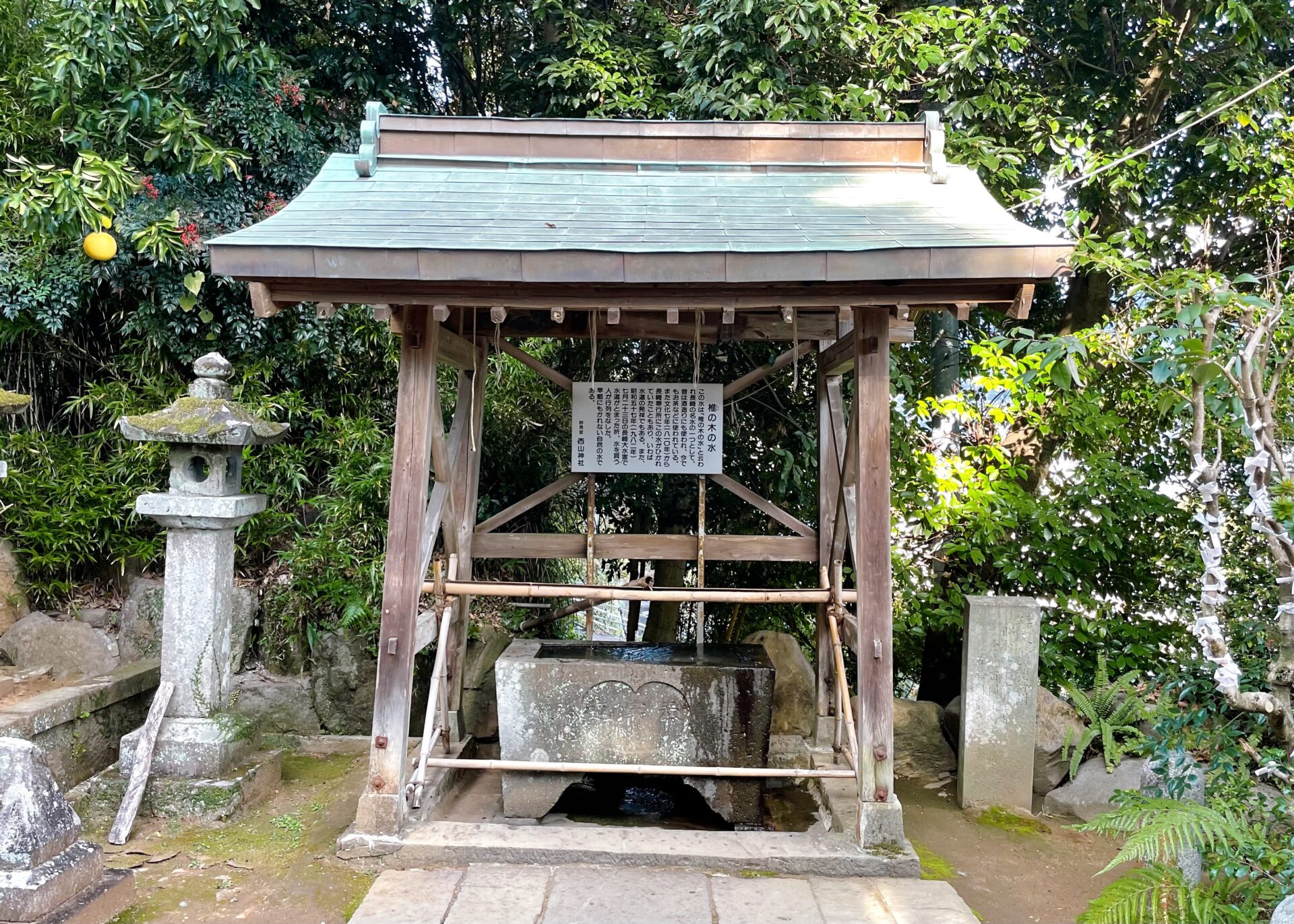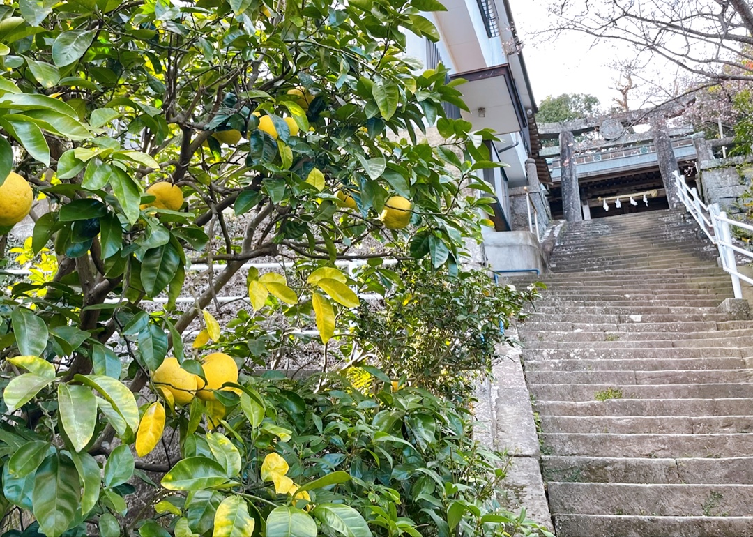 西山神社は、1719年、長崎聖堂の学頭である唐通事 盧草拙によって西山妙見社として創建され、1872年、現在の名称に改められました。本殿には妙見社の名残である白蛇や龍の絵が奉納され、手水舎には長崎奉行所にも水道を引いていた長崎名水「椎の木の水」の気配が満ちています。境内には、日本のザボンのルーツとなる元木があります。この元木は、1667年、唐船船長 周九娘から渡されたザボンの種子が境内で見事に育ったことから始まりました。元木の種子は、長崎から日本全国まで伝来し、ザボン漬けなどの銘菓が生まれるきっかけとなりました。