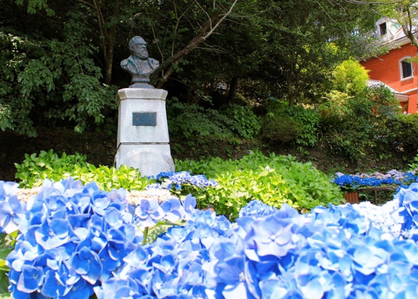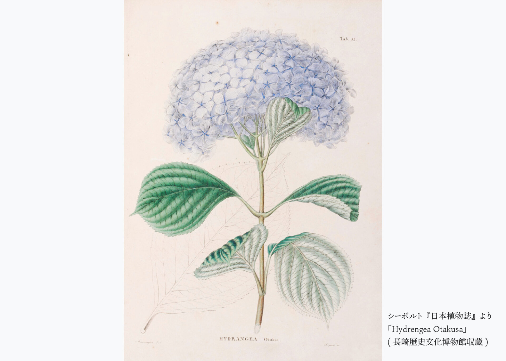 シーボルト記念館は、出島のオランダ商館医・博物学者として来日したシーボルトの生涯や偉業を紹介するミュージアムです。建物はオランダ・ライデンのシーボルト旧宅を模して作られ、館内には国指定重要文化財を含む資料が収蔵されています。博物学者の功績としては、美しい絵や図版を取り入れた『日本』、『日本植物誌』、『日本動物誌』を発行し、日本を紹介する名著として賞賛されました。シーボルトは紫陽花に特に愛着を持ち、『日本植物誌』では、愛妻 お滝さんにちなんで、学名「オタクサ」と記しました。梅雨の時期には植物庭園の紫陽花も雨に咲き、見頃を迎えます。