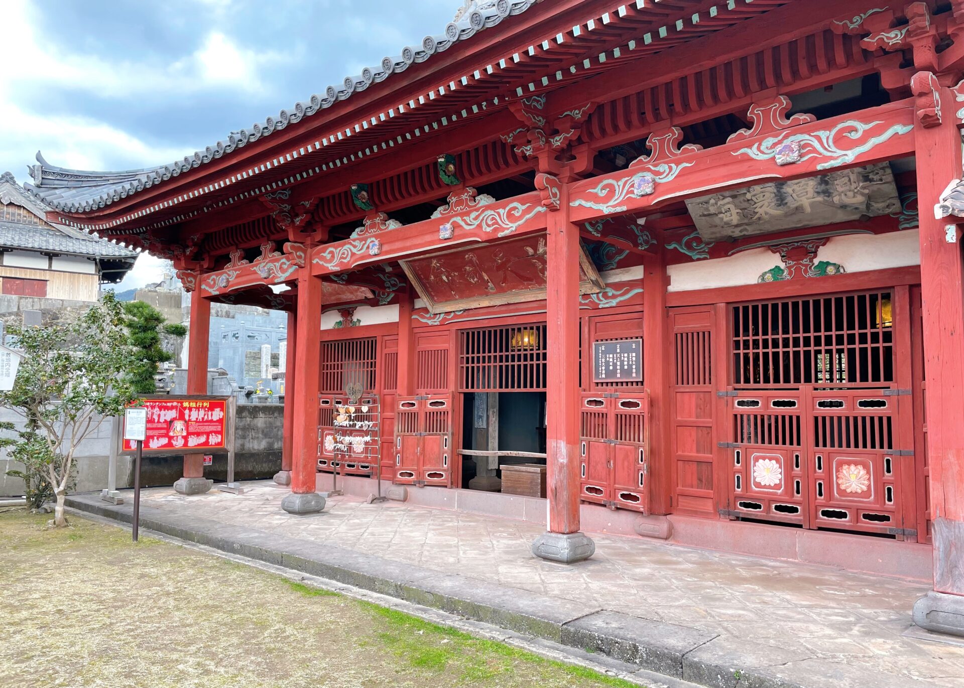 興福寺は、1620年創建の日本最古の黄檗宗寺院で、中国の高僧 隠元禅師が住職として滞在したことで有名です。隠元さんは、インゲン豆、ナス、スイカ、蓮根などの野菜・果物をはじめ、現代の生活にも馴染み深いダイニングテーブル、煎茶、印鑑、木魚、明朝体文字など多くのものを日本に伝えました。広々とした境内には、氷裂式組子の丸窓、アーチ型黄檗天井、瑠璃燈などの意匠が美しい国指定重要文化財の本堂や、お坊さんたちに飯時を知らせる魚の形をした鳴り物の魚板、中国貿易の象徴である航海安全の女神を祀る媽祖堂など、多くの見どころが点在しています。