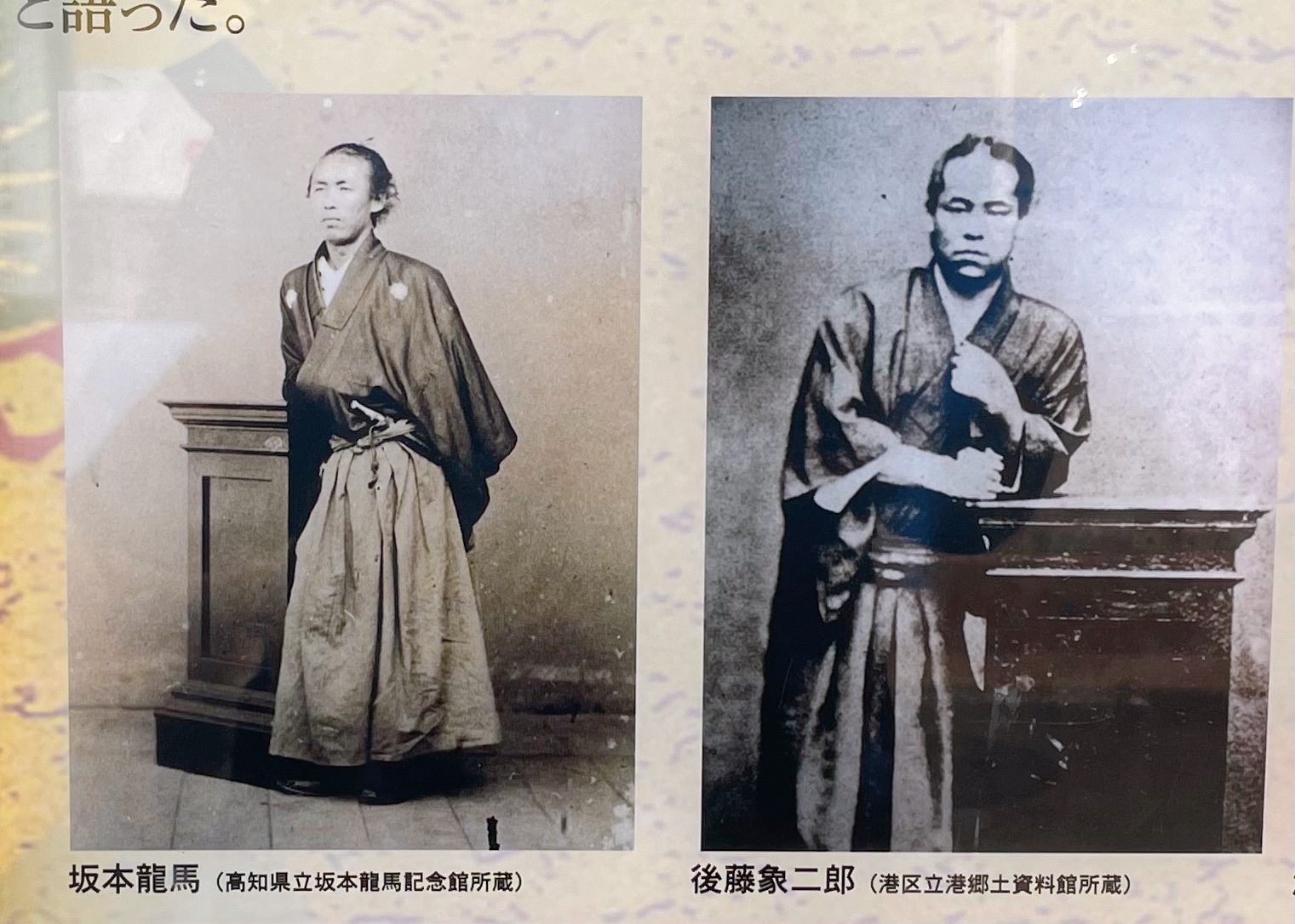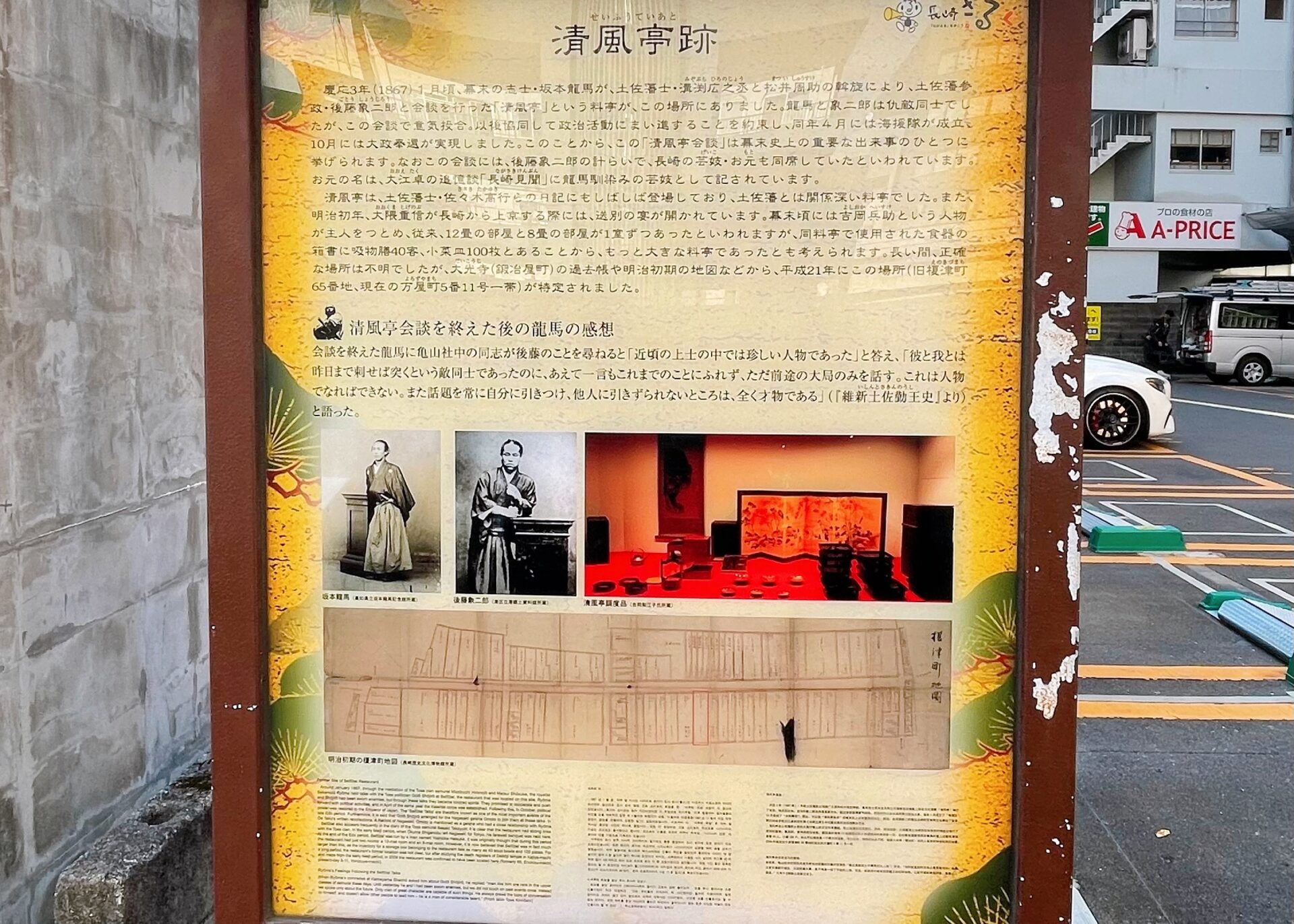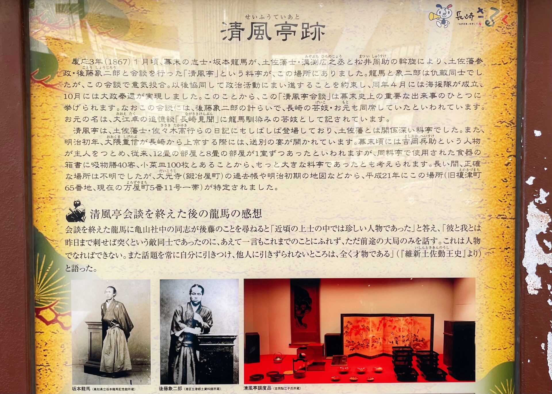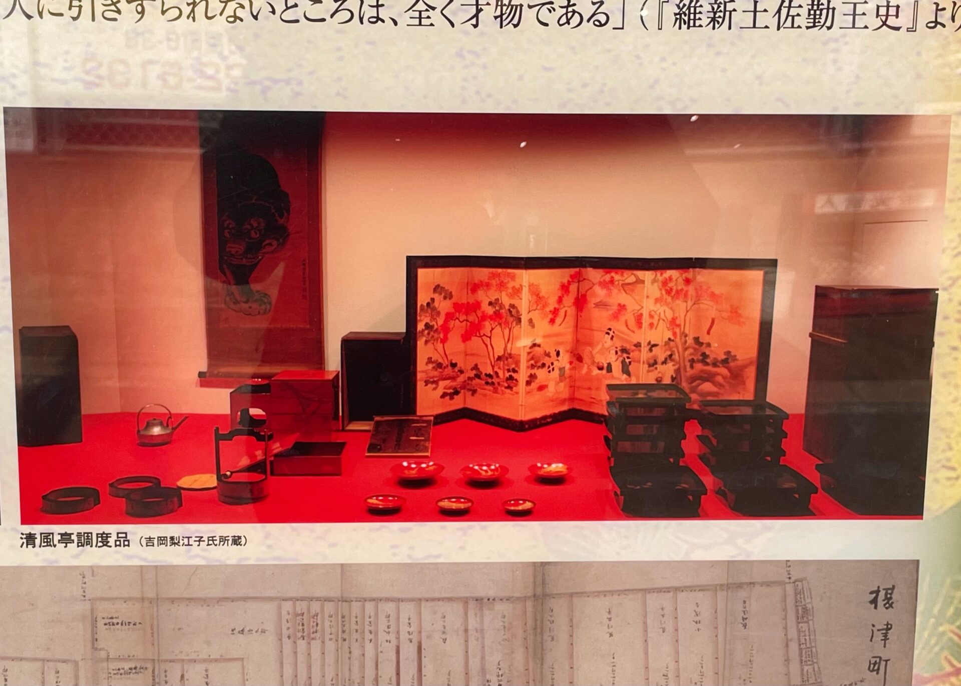 清風亭は、土佐商会に近いため藩御用達として利用されていた料亭です。1867年1月頃、清風亭の一室で、土佐藩を脱藩した身である坂本龍馬と土佐藩の重役である後藤象二郎という長年の仇敵同士が、歴史を動かす重大な会談を行いました。経営難のため亀山社中の解散を考えていた龍馬と、長州藩・薩摩藩に遅れをとっていることを焦る象二郎は、料亭に馴染みの芸妓を呼んで、杯を酌み交わして日本国家の未来を語り合い、意気投合しました。同年4月には、土佐藩を後ろ盾とした新商社「海援隊」が結成され、10月には政権を朝廷に返還する大政奉還の実現の道へと繋がりました。