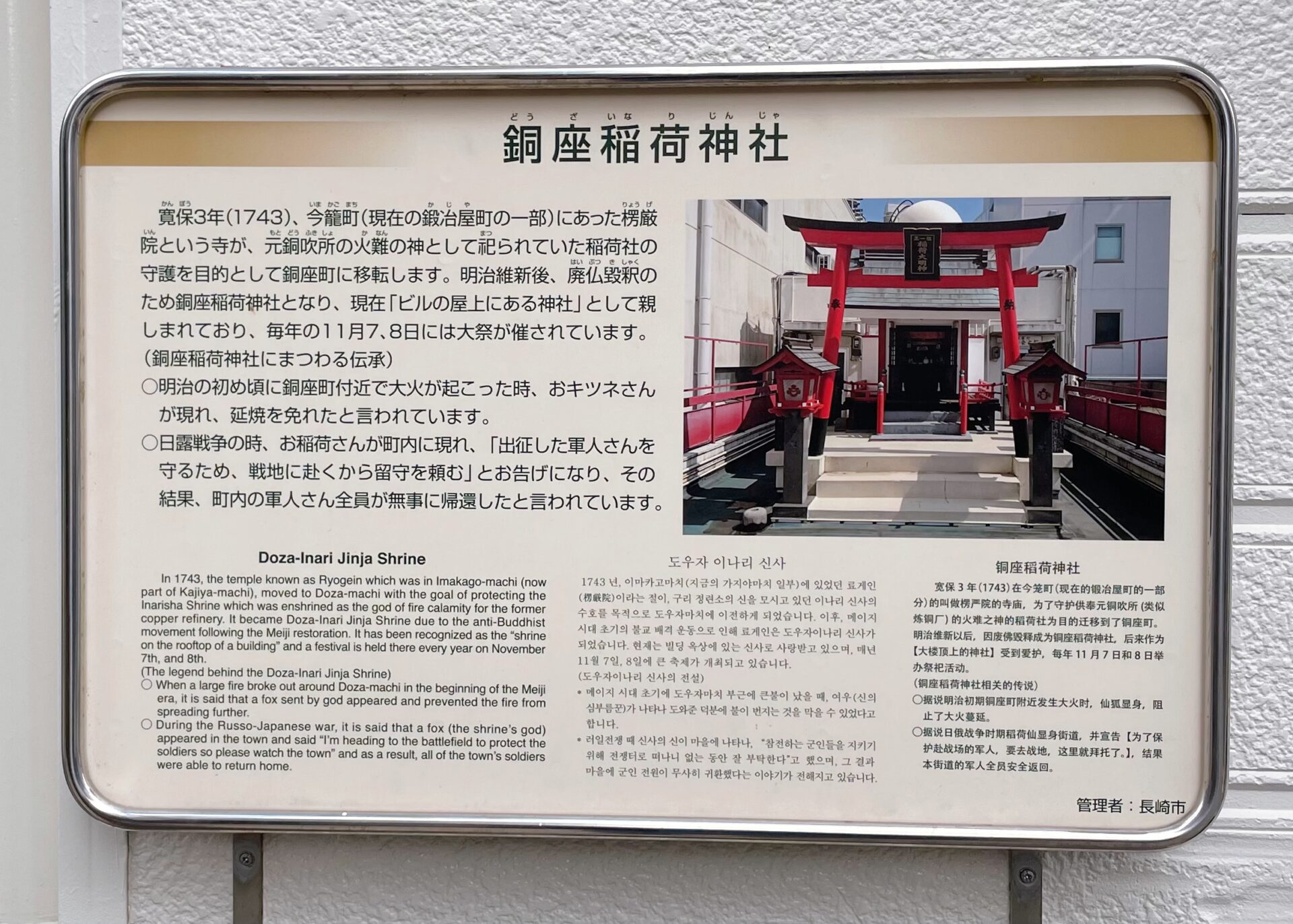 銅座稲荷神社は、1743年、銅鋳造所の火除の神様として祀られたことから始まり、飲食店街に様変わりした現在の銅座でも商売繁盛の神様として信仰されています。この神社には、二つの伝説が残っています。一つめは、明治時代、町で大火があったとき、稲荷神が神社の屋上に現れ、白い御幣をお振りになって火を鎮めたという話。二つめは、日露戦争で町民が出征したとき、「出征した町民の守護神として共に戦地に赴く」とお告げがあり、全員無事に帰還できたという話。ビルの屋上の本殿まで、朱色の外階段が数階続く特徴的な外観を持った、商業のまちらしい神社となっています。
