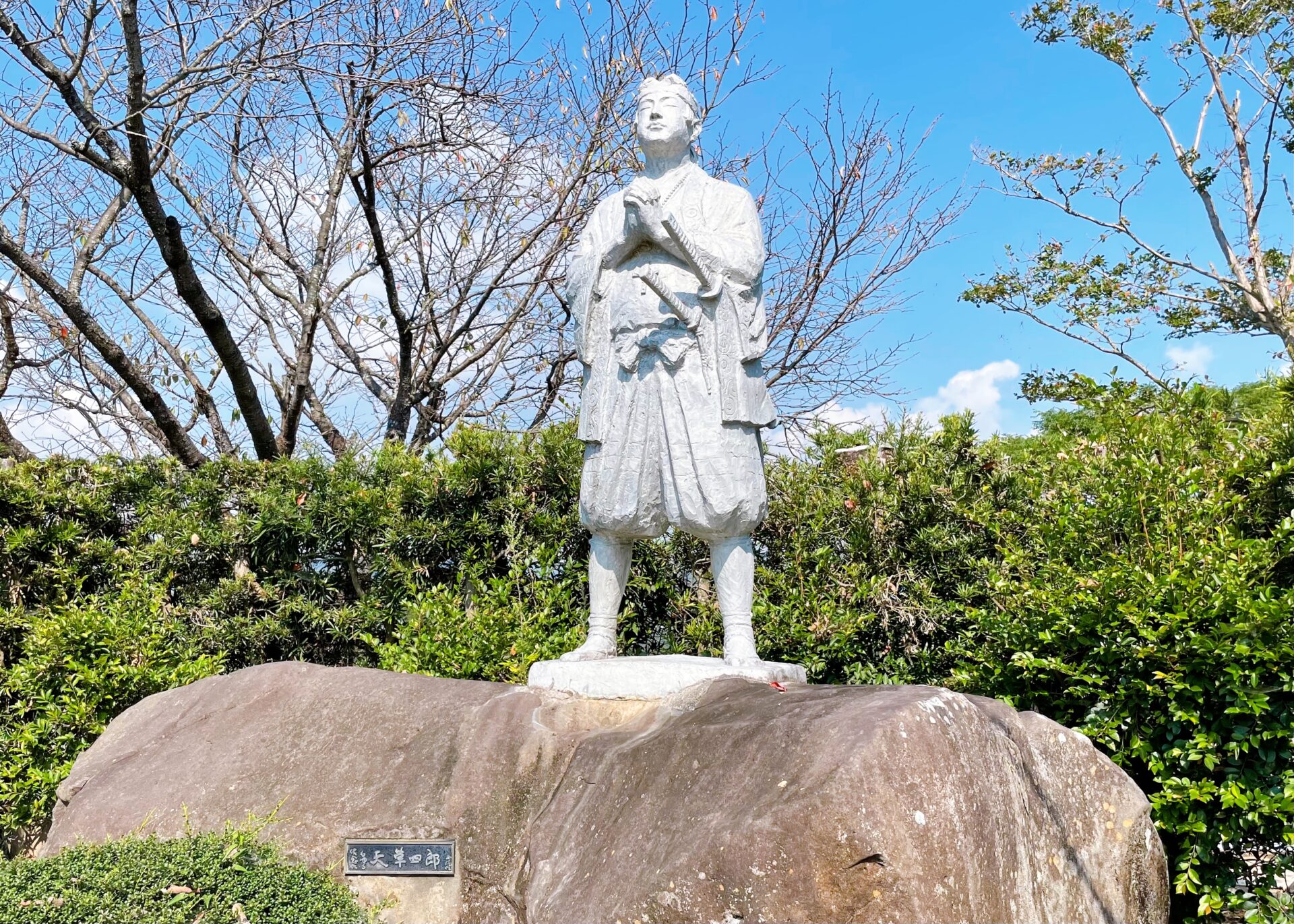 原城跡は、1637年、天草四郎を総大将として3万人以上のキリシタンや農民が立て籠った「島原・天草一揆」の舞台となった国指定史跡で、世界遺産「長崎と天草地方の潜伏キリシタン関連遺産」の構成資産です。島原藩主の過酷な重税やキリシタン弾圧により発生した日本最大級の一揆「島原・天草一揆」は、幕府軍約12万人の兵力で約4ヶ月をかけて制圧されましたが、幕府に大きな衝撃を与え、2世紀に渡る鎖国の確立、宣教師不在によるキリシタン潜伏が始まる重大な転機となりました。原城本丸跡には、《平和祈念像》で有名な北村西望の作で、情熱と信仰を表す《天草四郎像》が展示されています。