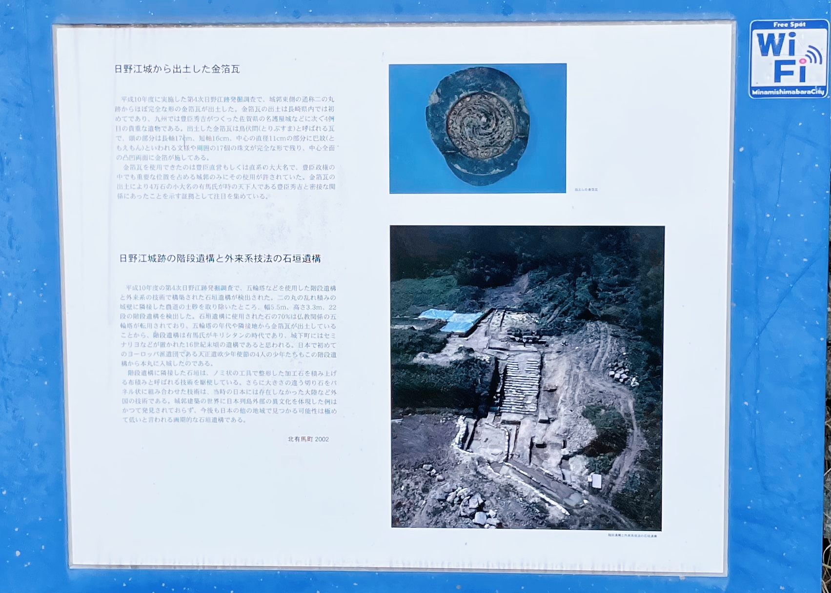 日野江城跡は、島原半島のキリシタン大名 有馬晴信の居城跡で、国指定史跡です。城下では、日本初のキリスト教教育機関 セミナリヨ設置、日本初のヨーロッパ訪問団 天正遣欧使節を派遣するなど、国際交流の最先端地として大いに栄えました。現在の城跡は、本丸・二の丸・大手道・城壁・空堀が現存し、南蛮貿易を象徴する陶磁器、豊臣秀吉との関係を物語る金箔瓦が出土しています。宣教師ルイス・フロイスは、城の様子について「部屋はすべて黄金の品や雅で華麗な絵画で飾られ、日本にこれほど壮麗な建築物があるとは考えてもみなかった。」とイエズス会年報に書き記しています。