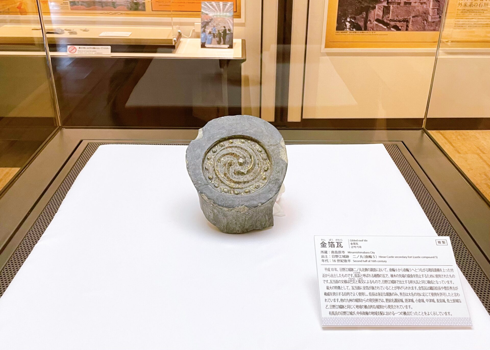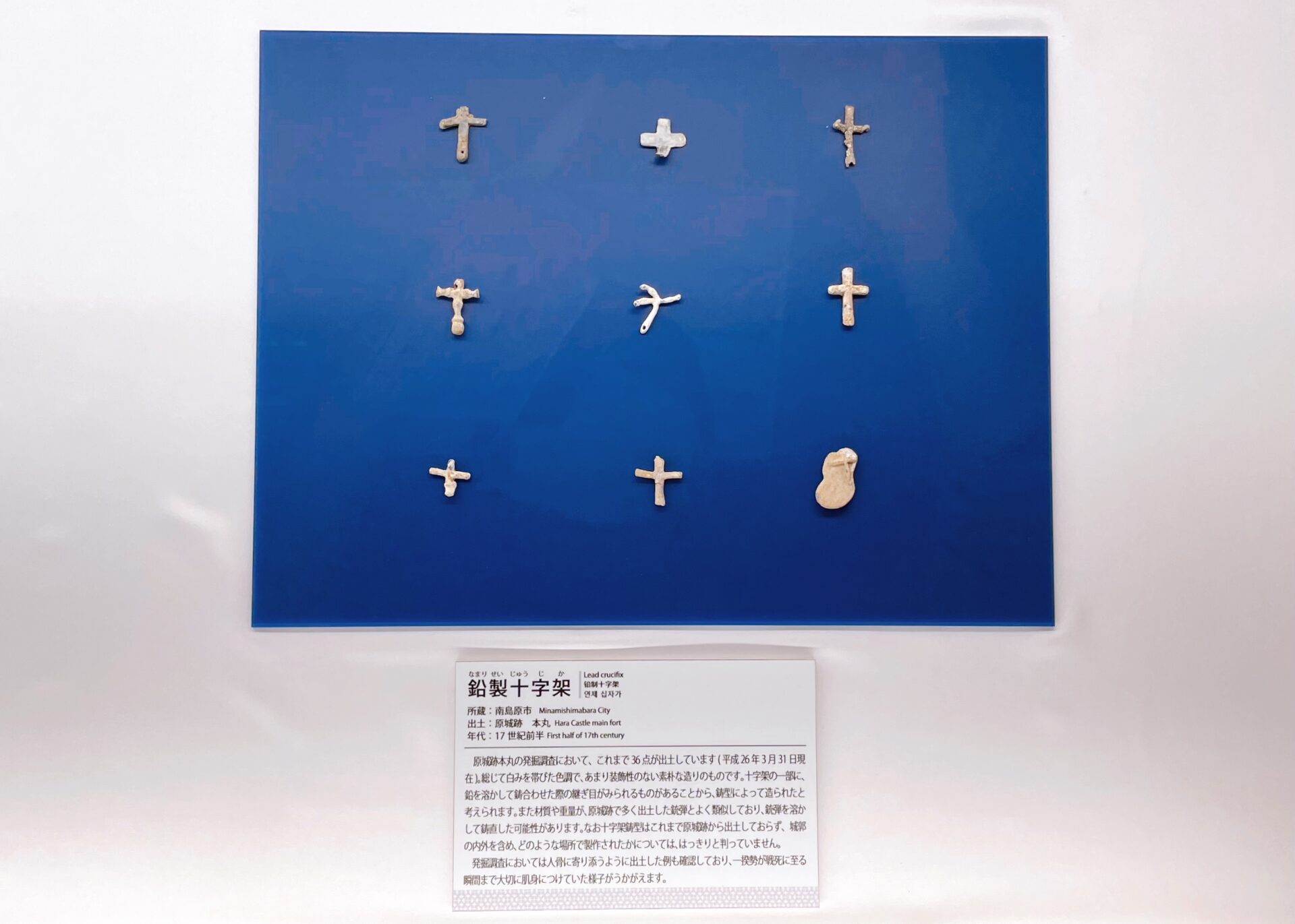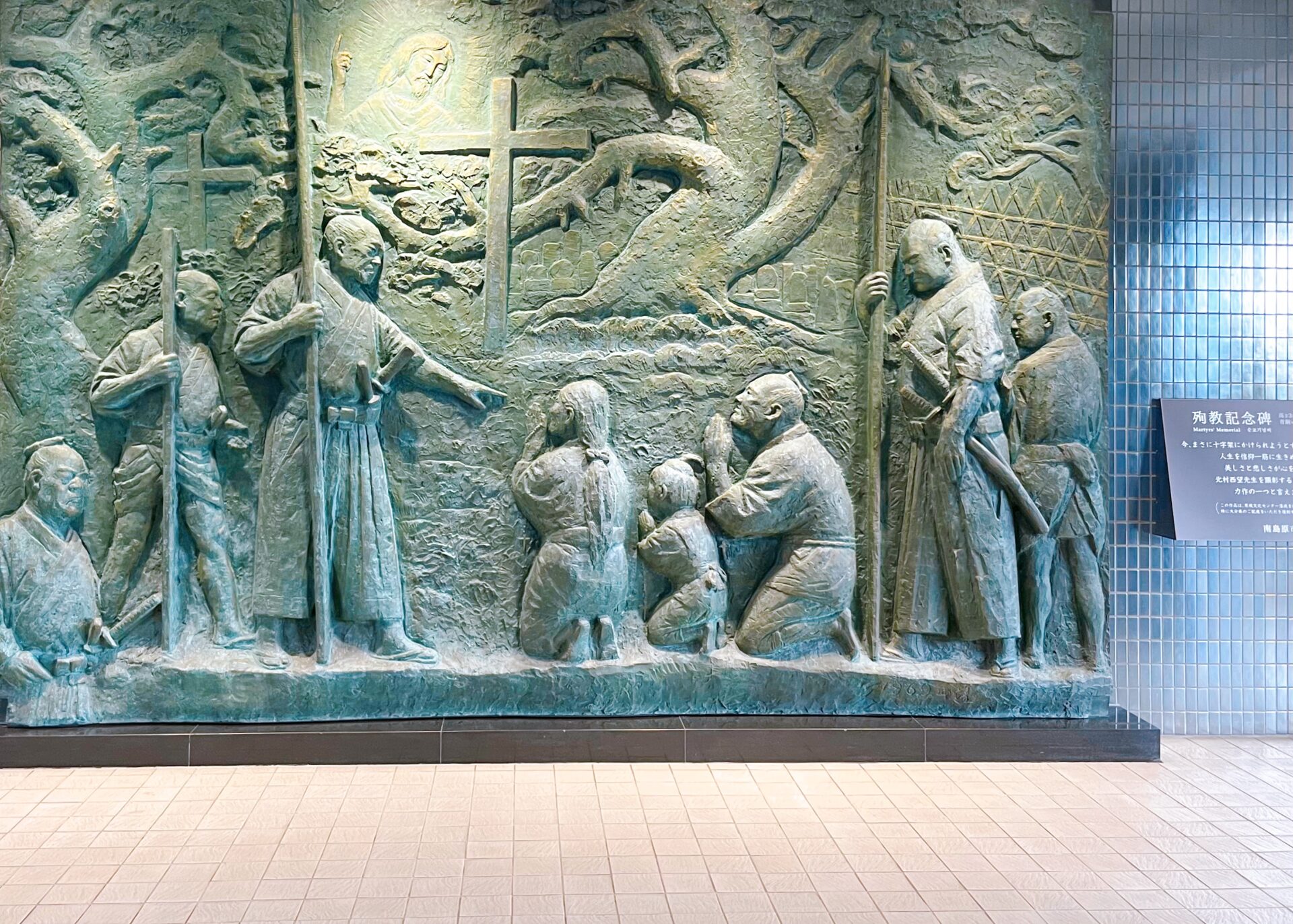 有馬キリシタン遺産記念館は、 国指定史跡 日野江城跡、世界遺産 原城跡をはじめとする南島原市のキリシタン史を紹介するミュージアムです。館内は、日野江城の金箔瓦、グレゴリオ聖歌の楽譜、活版印刷機などが展示されたキリスト教の伝来から繁栄を示す「光」の歴史、島原・天草一揆の舞台となった原城跡の十字架・ロザリオ、一揆勢の切実な思いが綴られた矢文などが展示されたキリシタン弾圧の悲劇を示す「影」の歴史という2部構成の展示空間となっています。またエントランスには、《平和祈念像》で有名な北村西望のレリーフ《キリシタン殉教記念碑》が展示されています。