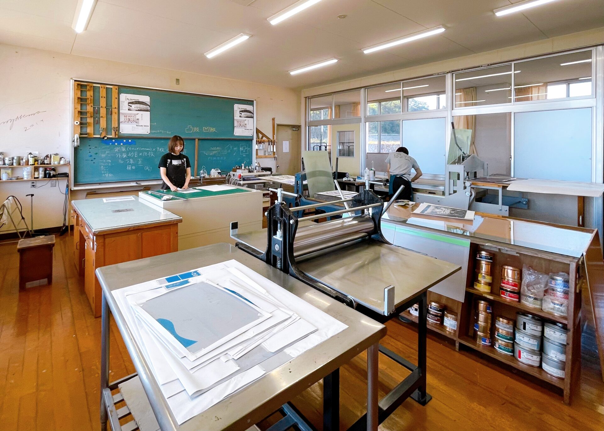 アートビレッジ・シラキノは、日本初の銅版画が制作された地である歴史にちなみ、若手芸術家支援・地域文化発展を目的に設置された芸術文化複合施設です。建物は、旧白木野小学校校舎をリノベーションしており、3階に銅版画・リトグラフ・木版画・シルクスクリーンに対応した版画工房、2階に宿泊施設、1階に銅版画の刷り工房と2つのギャラリーが設置されています。館内では、地域に招聘した芸術家による創作活動や定期的な展覧会が実施されています。また同校は、《平和祈念像》の作者 北村西望の母校で、校庭には胸像《西望自作像》も残っており、芸術に縁の深い場所となっています。