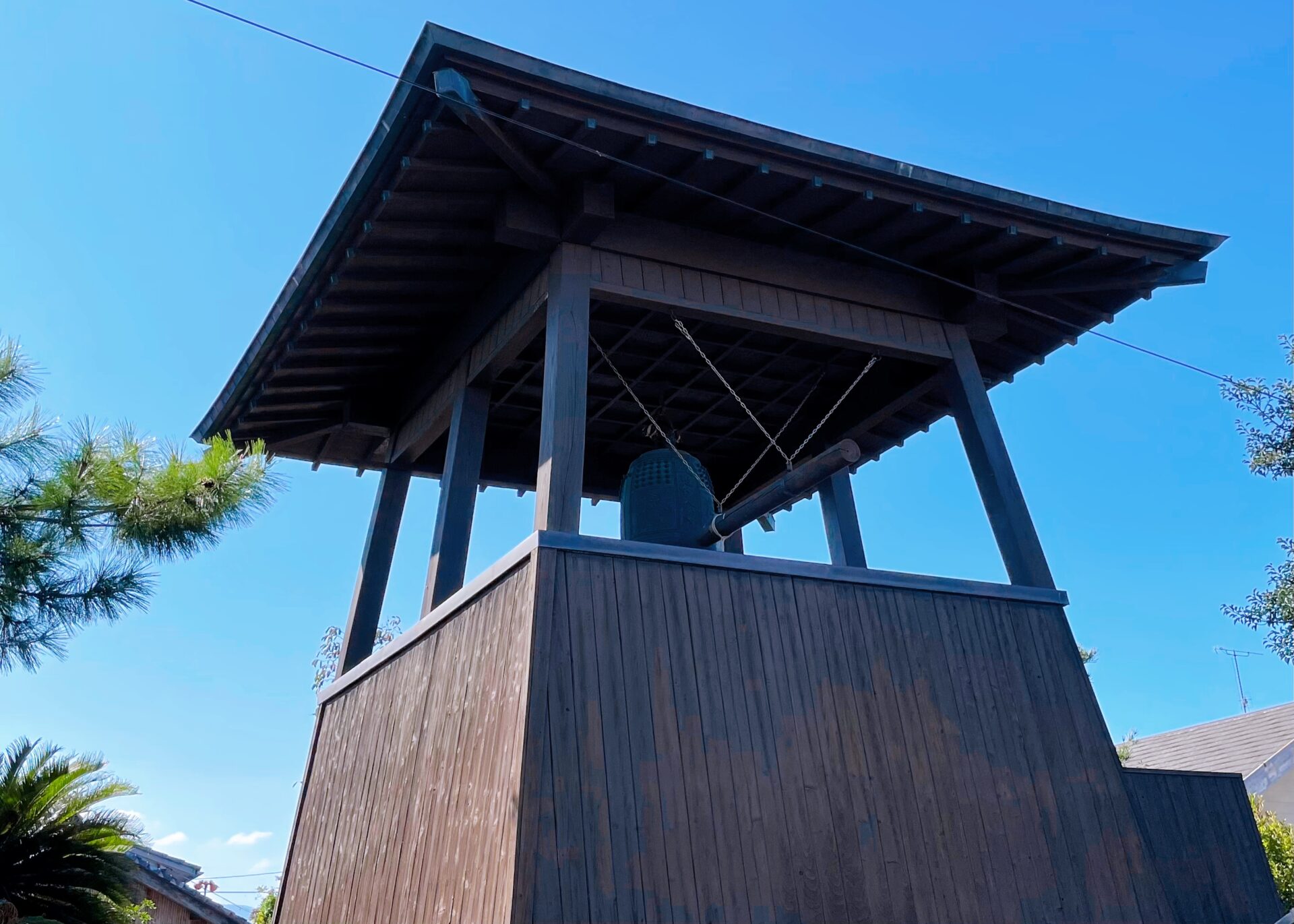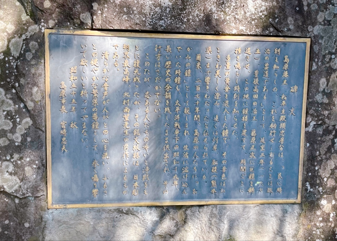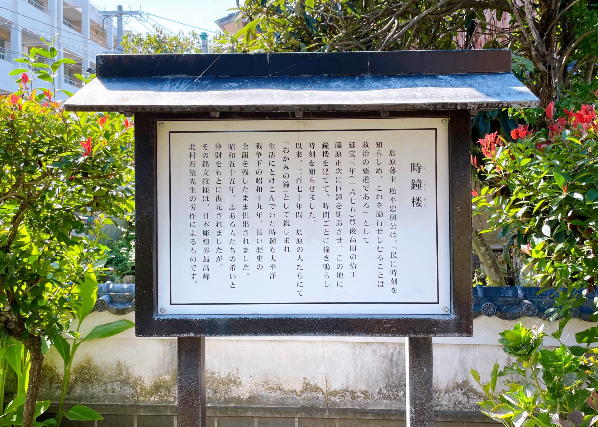 時鐘楼は、1675年、初代島原藩主 松平忠房が「人々に時刻を知らせ、守らせることは政治の中でも大切なことである」として建立したものです。当時の鐘は、豊後国中島の藤原正次の作と言われ、高さ1.3メートル、多量の純金を混ぜた青銅製でした。堂の下は音を共鳴させる特殊な空洞構造で、美しく澄んだ鐘の音は、時には対岸の熊本まで響き渡ったと伝えられています。長らく「お上の鐘」として親しまれていましたが、1944年、戦争の金属供出命令で失われました。現在の鐘は、1980年、昔をしのぶ人たちの寄付により復活したもので、銘文や模様は《平和祈念像》で有名な北村西望の作となっています。