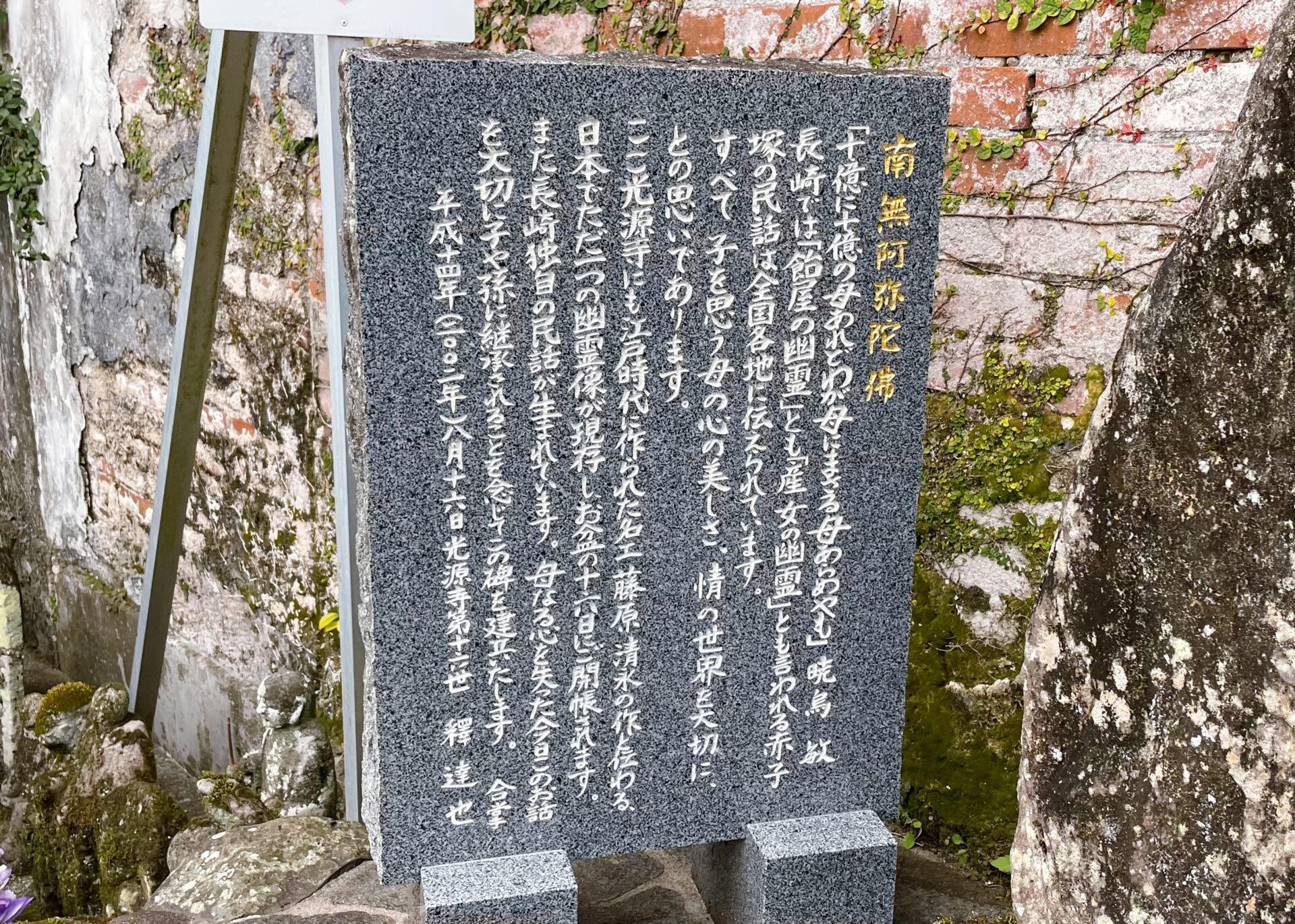 光源寺は、1637年に開山した浄土真宗本願寺派の寺院です。当初は銀屋町に位置していましたが、1676年に火災が起こり、現在の伊良林の地に移転しました。読経や法話、紙芝居などで仏の心を学ぶ「ひかり子ども会」、どなたでもお参りできる「日曜礼拝」など様々な行事を行っており、気軽に足を運ぶことができます。光源寺といえば、亡くなった母親の幽霊が、生まれたばかりの我が子を不憫に想い、飴で育てていたという長崎の民話「飴屋の幽霊」の舞台として有名です。民話にまつわる光源寺の寺宝「産女の幽霊像」は、年に一度、夏にご開帳されます。