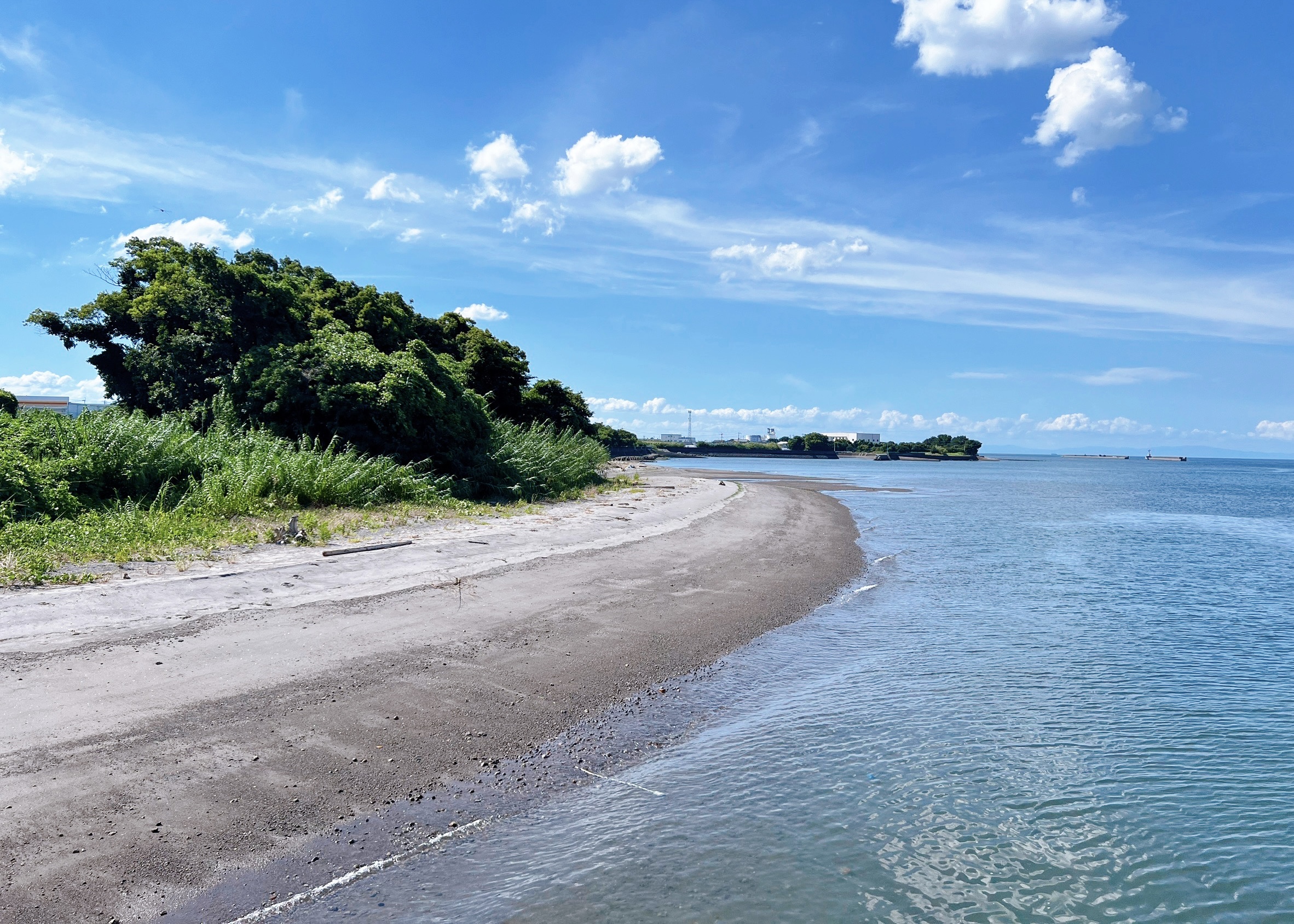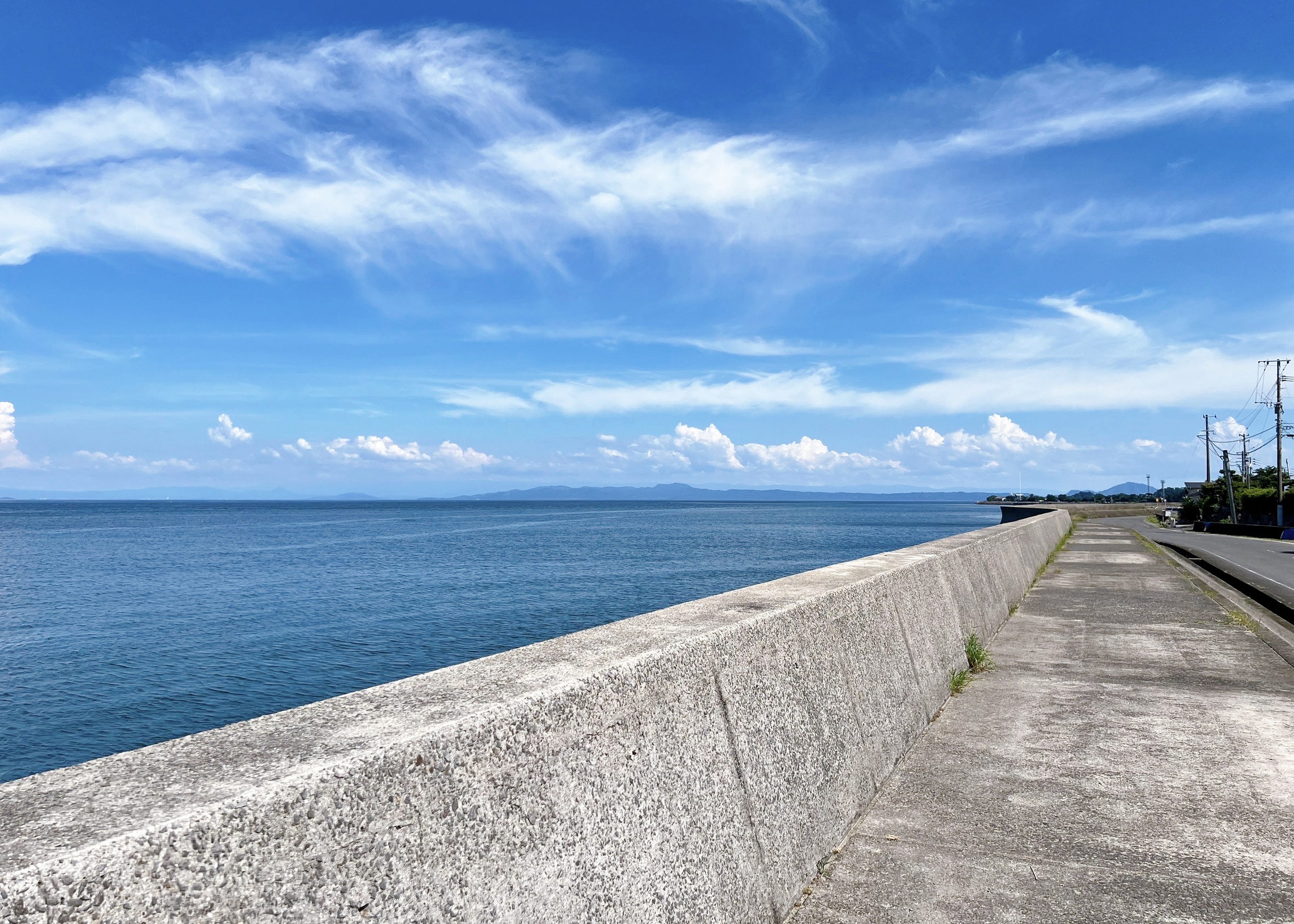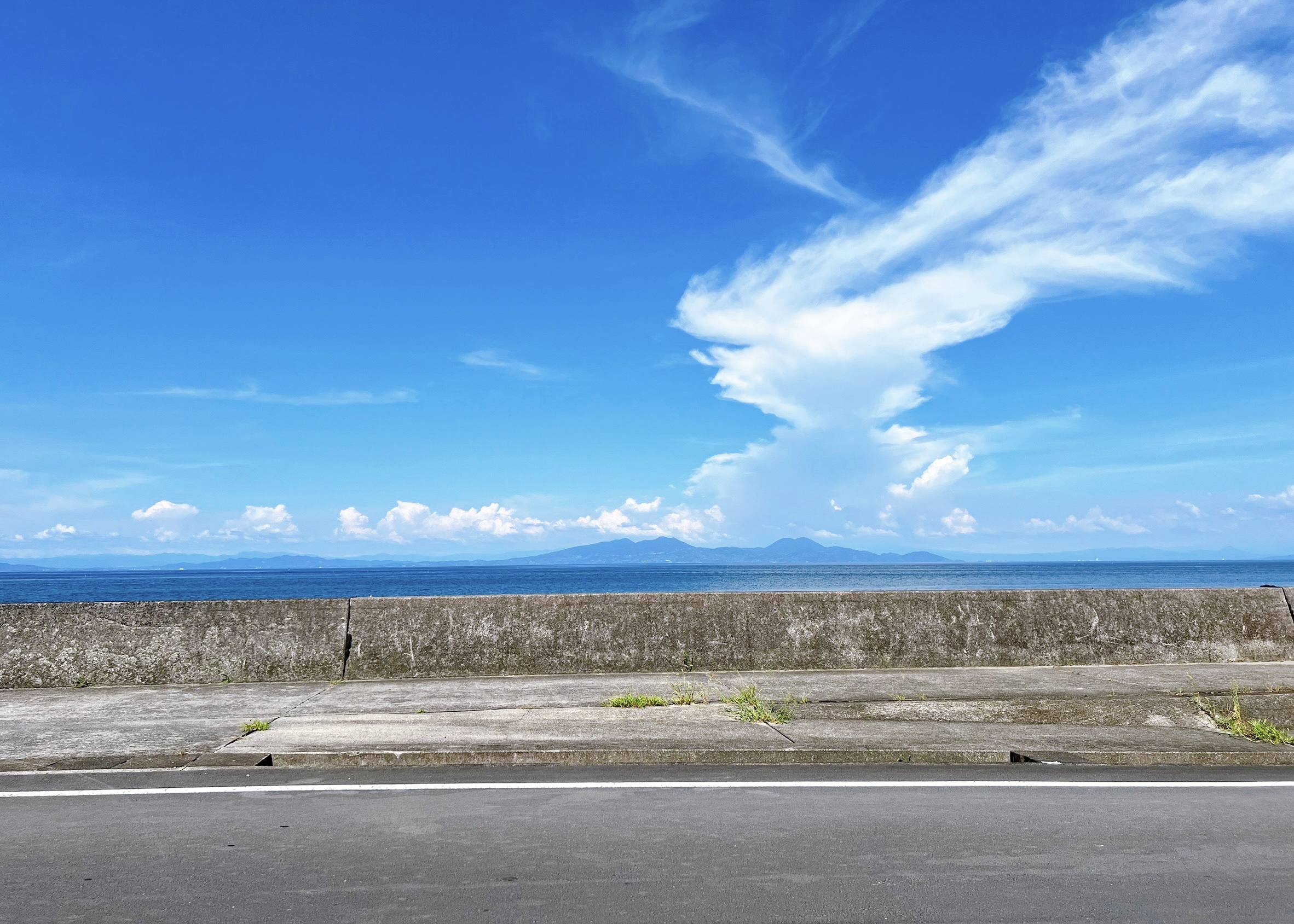 国道251号沿いを島原駅から諫早方面に進み、マクドナルドを右手に曲がると見える猛島海岸。自転車で道を下った先の踏切とまっすぐ伸びる道、前方に広がる海は、さながら映画のワンシーンに迷い込んだような気持ちにさせてくれる。真夏の海辺は、思っているよりも涼しくはない。海からの湿度の高い熱気と砂浜の照り返しが、鼓膜を突き刺すように夏を叫んでいる。嫌になるほどの暑さだが、海の輝きと入道雲の美しさに魅せられて、また来たいと思わせてくれる、そんな場所だ。時間にもよるが海岸沿いの道には釣りをしている人がいる。どうやらシーバスやメバル、チヌなんかが釣れるらしい。釣り目的で行くのもありかもしれない。