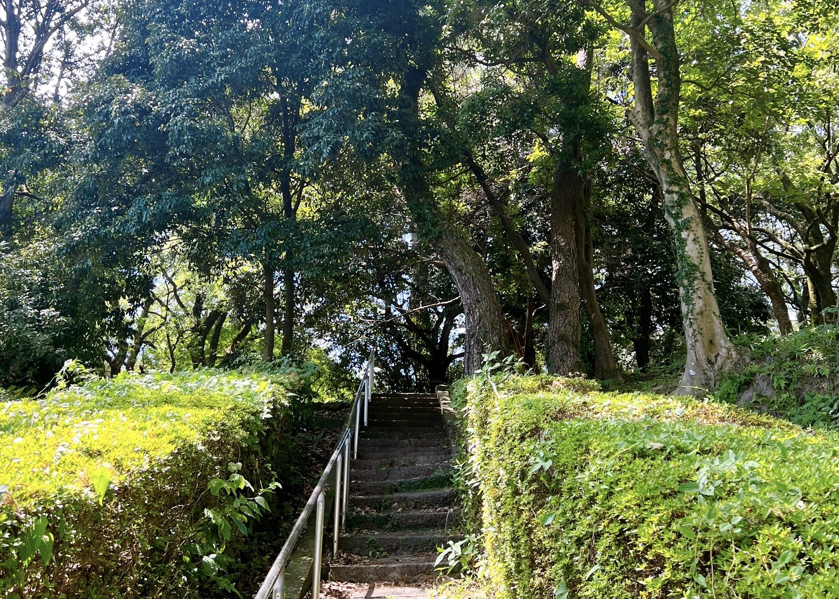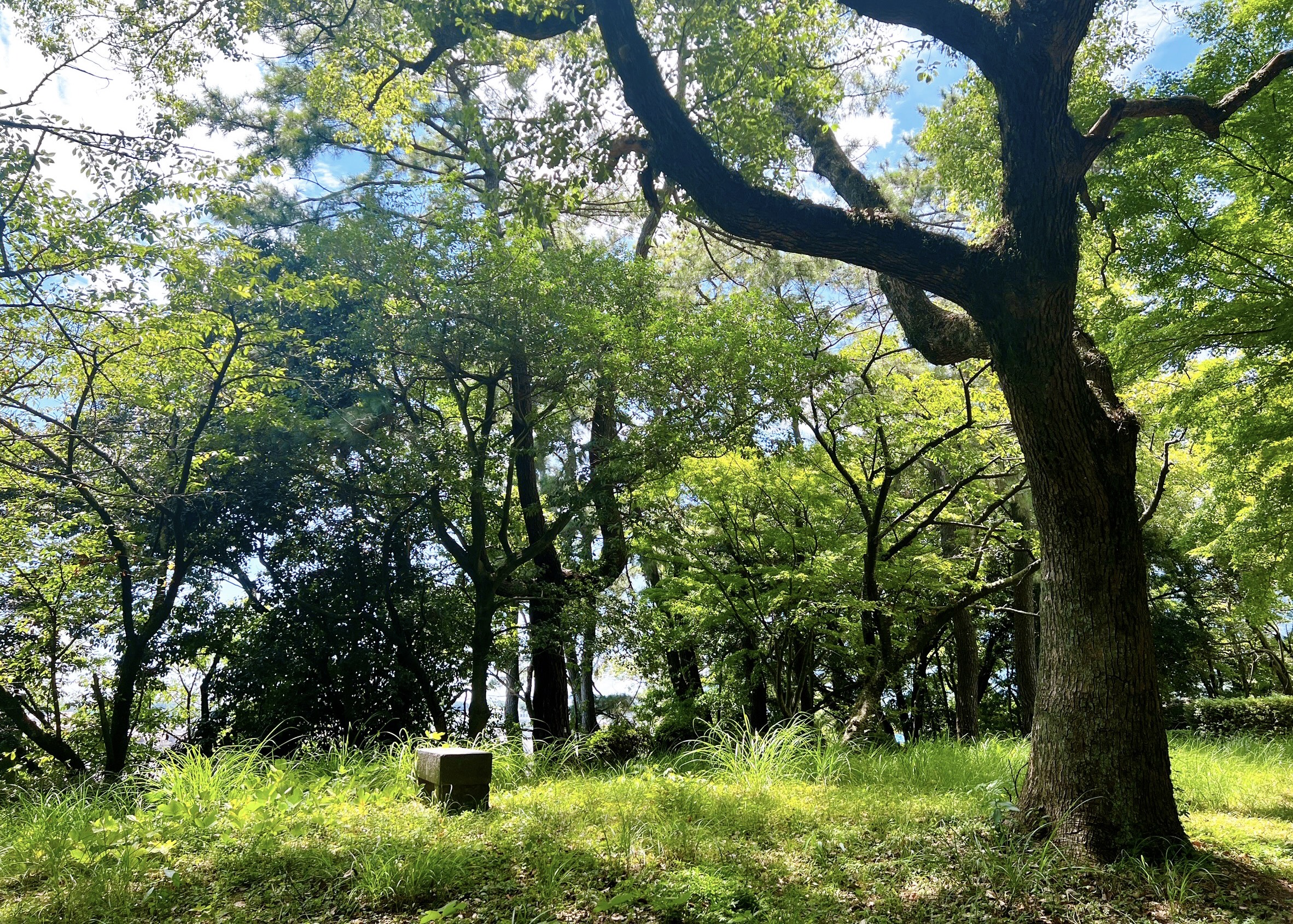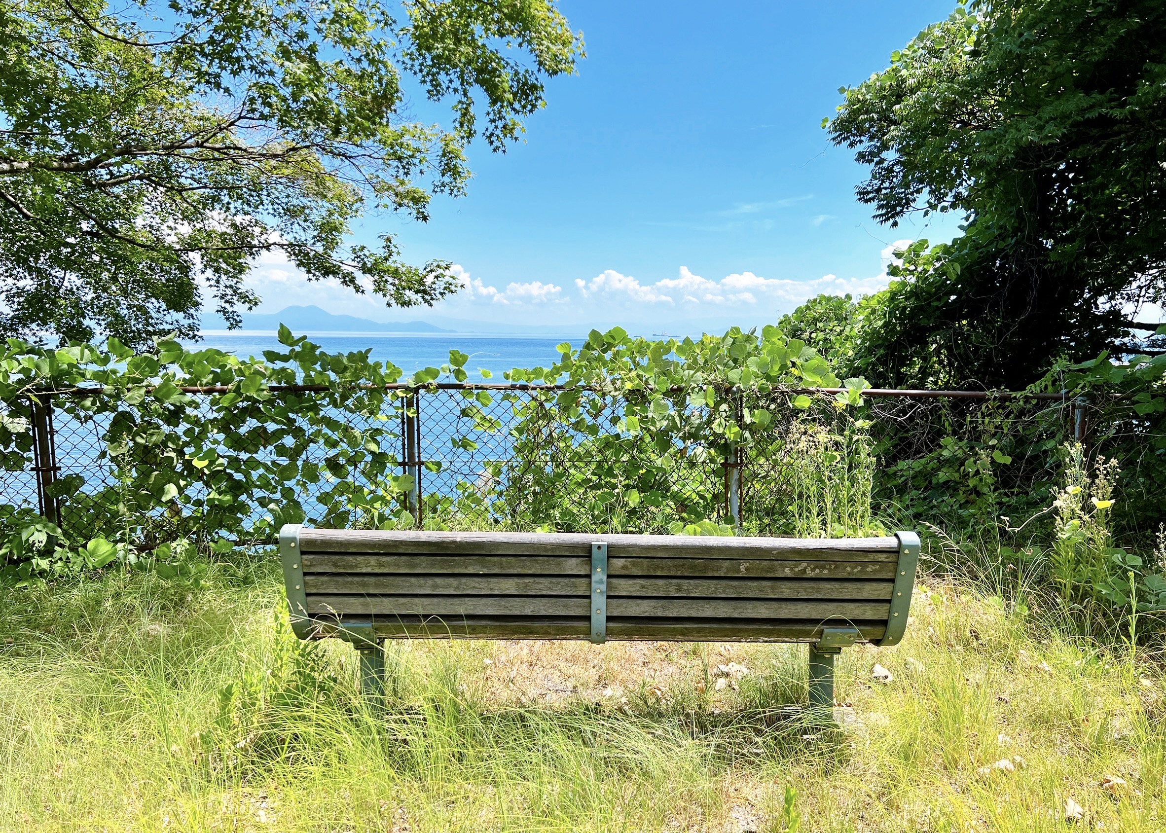 霊丘公園の海側東端、現在工事中のサッカーグラウンドより更に海側に見える小高い丘。階段というよりは、段差付きのスロープといった方が似合うやや荒々しい階段を登ると、それは見えてくる。まず真っ先に目に入るのは、何かを囲んでいる怪しげな塀だ。森の中にあるだけに重々しい神妙な雰囲気を醸し出しているその正体は、島原護国神社である。背の高い草に囲まれて見えづらいが、戦没者を祀る石碑と祠がある。その奥に見えるのが僕がすごく推している「海の見えるベンチ」だ。(ちなみに、僕が個人的に名付けた愛称である。)周りを木々に囲まれたこの場所で、セミの声を聞きながら海風を浴びるこの時間は、癒しの非日常そのもの。最高のロケーションで、ほのぼの系物語の主人公気分を味わうことができる。