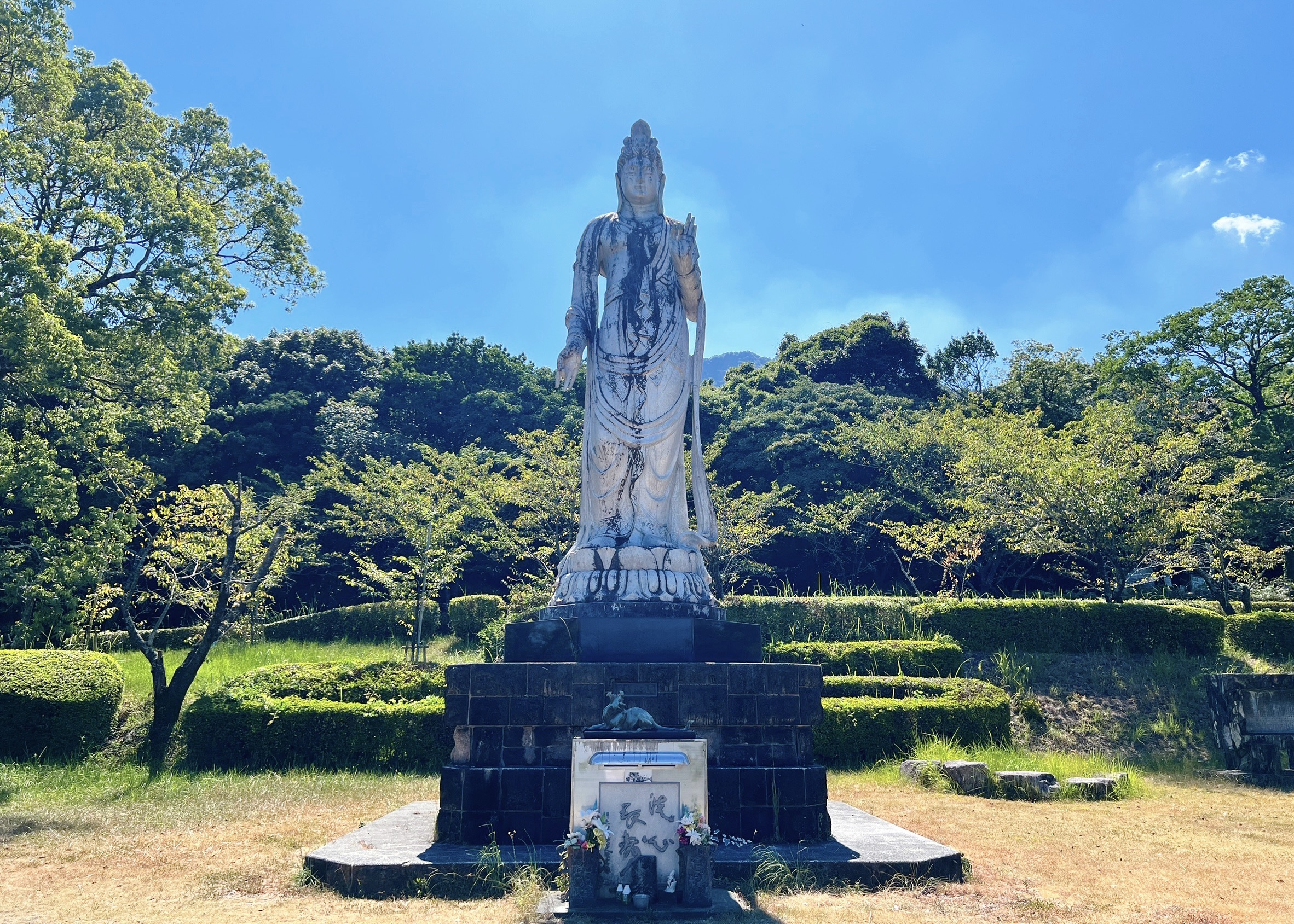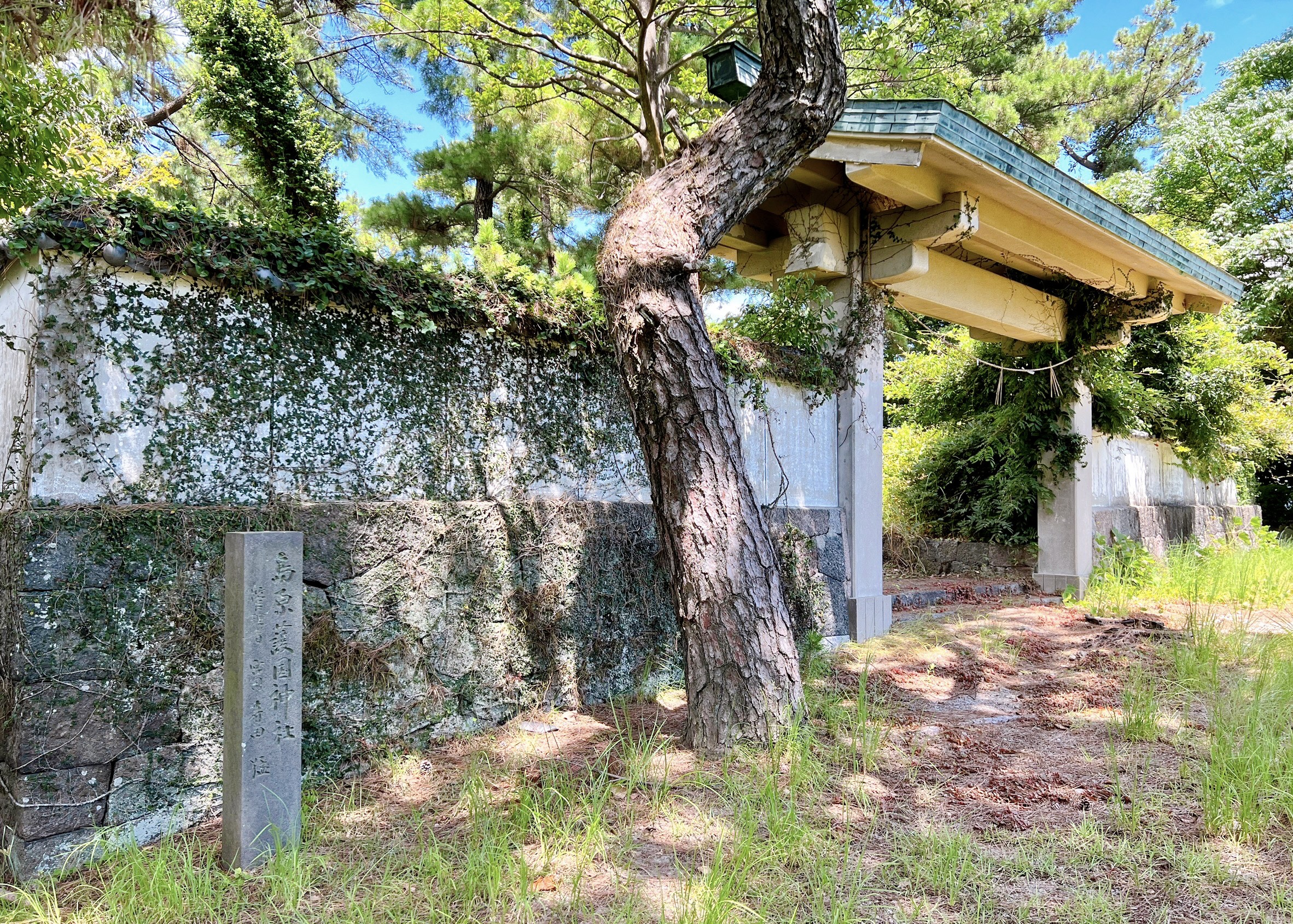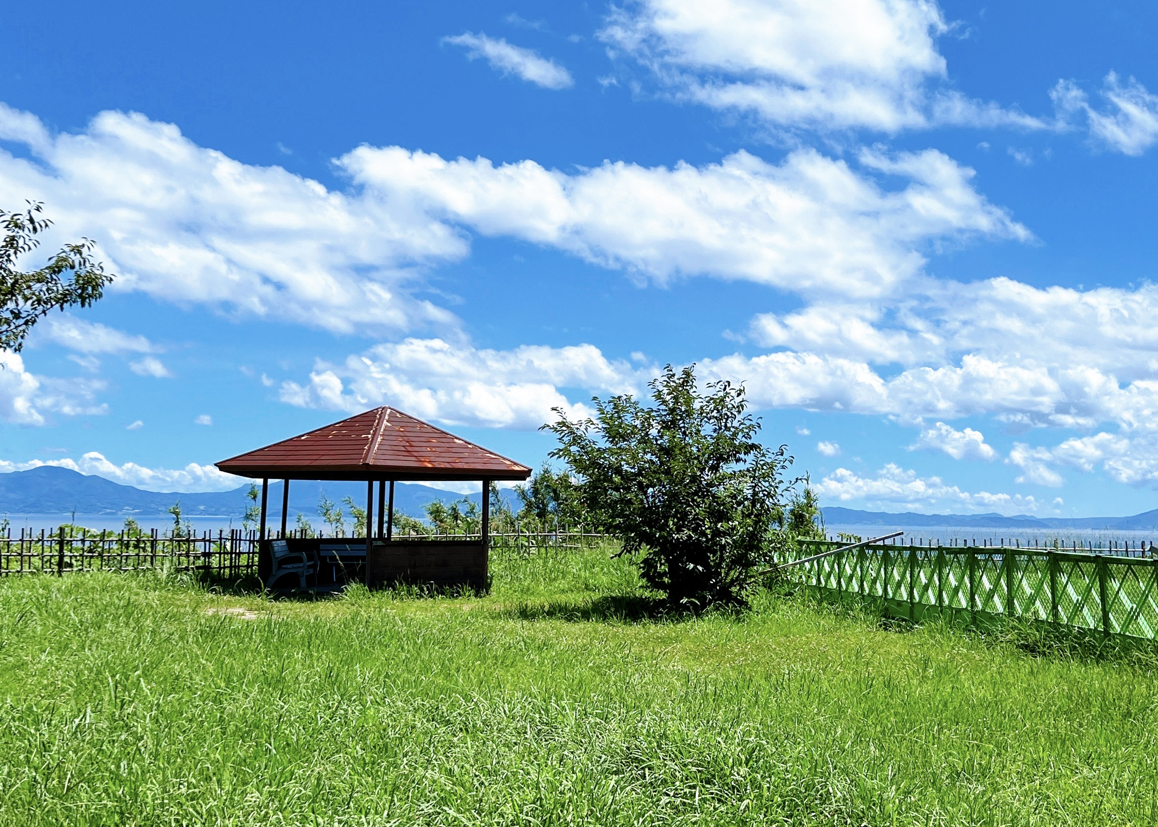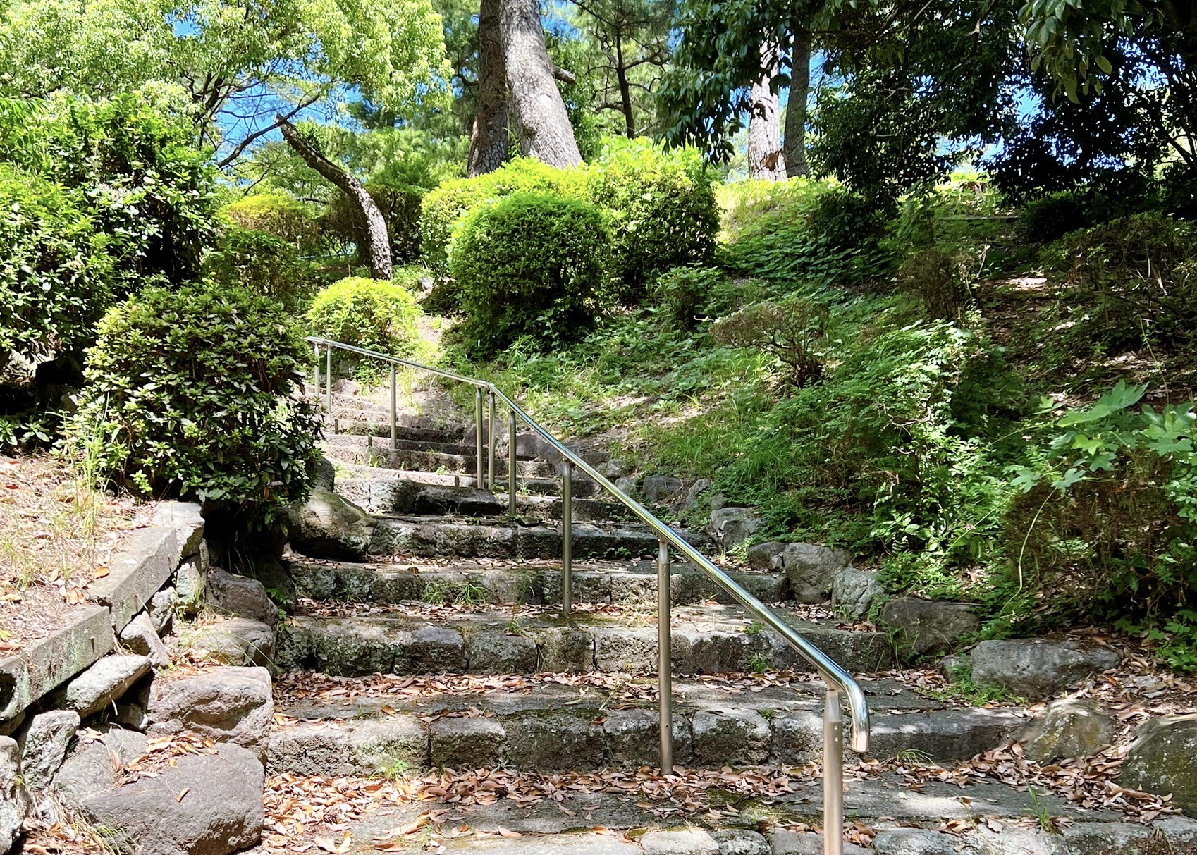 霊丘公園の海側東端、現在工事中のサッカーグラウンドより更に海側に見える小高い丘。階段というよりは、段差付きのスロープといった方が似合うやや荒々しい階段を登ると、それは見えてくる。まず真っ先に目に入るのは、何かを囲んでいる怪しげな塀だ。森の中にあるだけに重々しい神妙な雰囲気を醸し出しているその正体は、島原護国神社である。背の高い草に囲まれて見えづらいが、戦没者を祀る石碑と祠がある。その奥に見えるのが僕がすごく推している「海の見えるベンチ」だ。(ちなみに、僕が個人的に名付けた愛称である。)周りを木々に囲まれたこの場所で、セミの声を聞きながら海風を浴びるこの時間は、癒しの非日常そのもの。最高のロケーションで、ほのぼの系物語の主人公気分を味わうことができる。