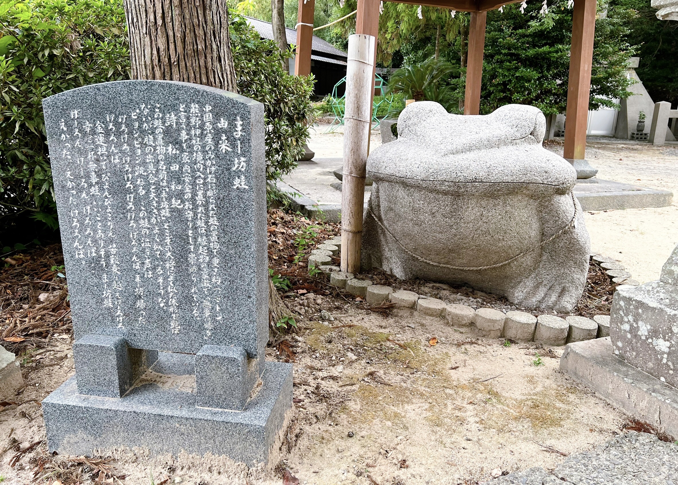 フードショップまきから見える石の鳥居、その参道の奥に温泉熊野神社はある。まず迎えてくれるのは、カエルの石像と、小石がたくさん乗った小さな鳥居だ。この神社にはいくつかの遊具があることから、夕方になると子供たちが集まる。子供たちの間で、「鳥居の上に石を乗せれたら願いが叶う」という噂が流行ったために、たくさんの小石が乗っているのだ。(投げた石が落ちてきて怪我をすることもあるので、真似はしないでほしい。)すぐ隣にある森の中から、たくさんの蝉の声やキジバトの声が聞こえてきて、境内はなんだかほのぼのとする。さて、この神社にまつわる僕の推しポイントは、温泉熊野神社の御手水には、季節によって鮮やかな草花が泳いでいること。とても綺麗なので、是非見に行ってみてほしい。